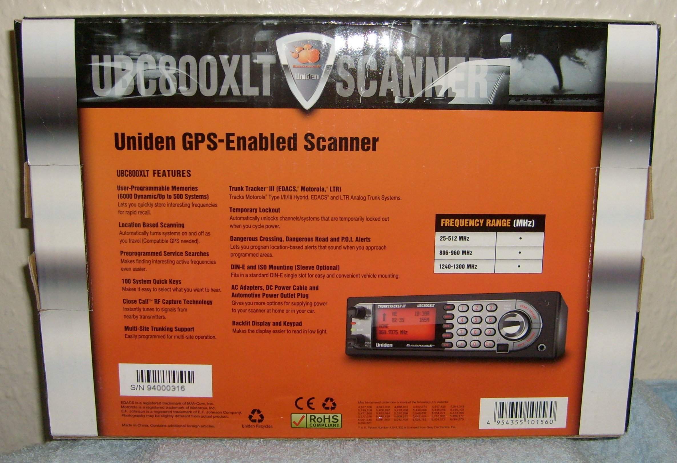 RS-232C. Tracks Motorola. EDACS, and EF Johnson systems.